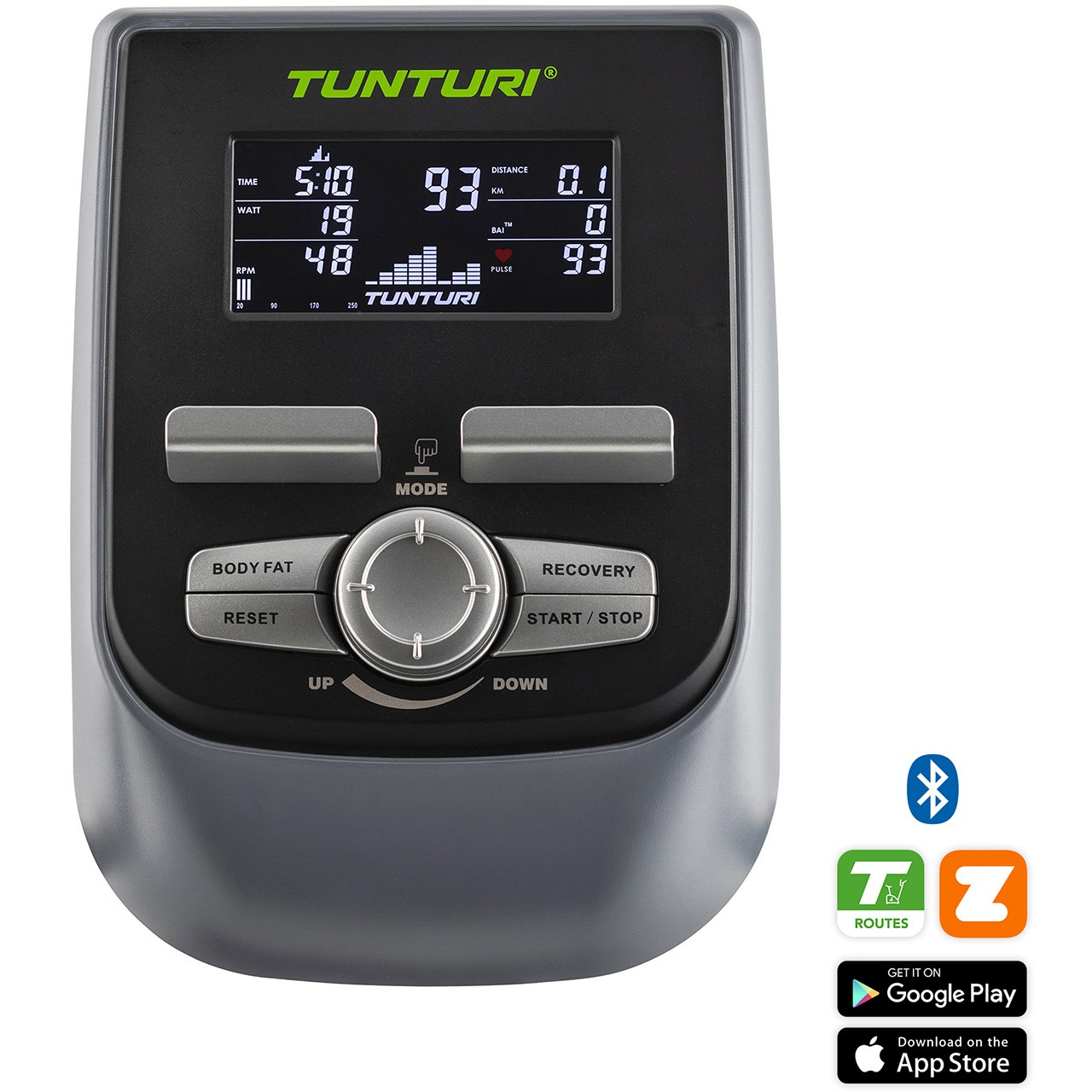 | Apps pour tablettes et smart phones: | Tunturi Routes, i-Console+, Kinomap & Zwift |