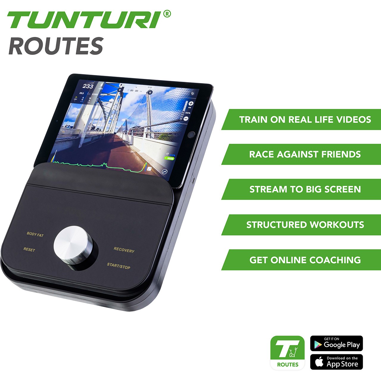 | Apps pour tablettes et smart phones: | Tunturi Routes, i-Console+, Kinomap & Zwift |