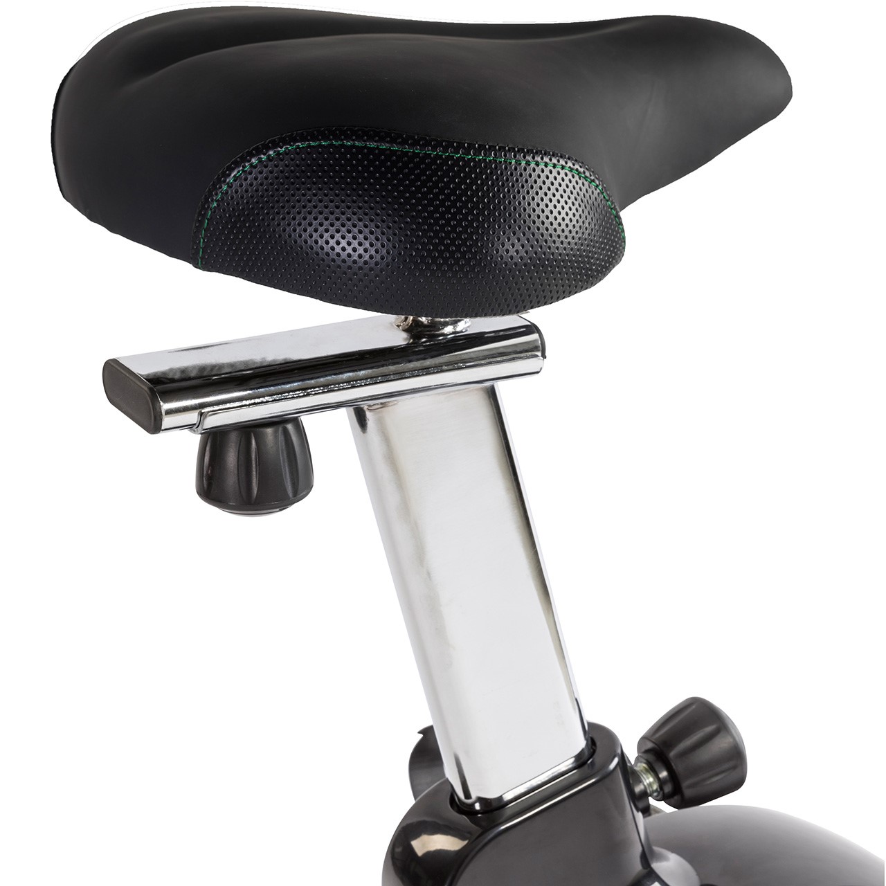 Une roue d'inertie de 14 kg, 43 programmes d'entraînement et 58 niveaux de résistance assurent un entraînement équilibré. L'utilisation se fait via un écran TFT intégré et une navigation simple du menu avec un bouton rotatif, ce qui rend ce vélo d'appartement extrêmement convivial. La résistance contrôlée électroniquement atteint jusqu'à 600 watts. Avec un poids maximal de l'utilisateur de 150 kg et son système de freinage à aimant permanent, l'appareil est nettement plus silencieux que la plupart des ergomètres sur le marché. Cela signifie également que vous n'aurez pas à vous soucier de remplacer les plaquettes de frein. La mesure de la fréquence cardiaque se fait confortablement via les poignées, ou alternativement avec une ceinture pour le bras ou la poitrine.