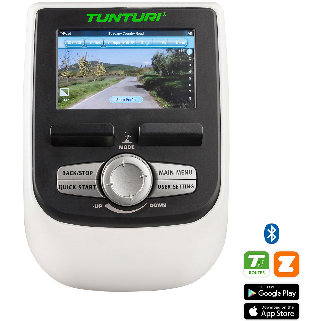 Grâce à la connectivité Bluetooth, vous pouvez connecter votre tablette ou smartphone et profiter des fonctionnalités fascinantes des applications Tunturi Routes et Kinomap. Ces applications offrent une expérience d'entraînement interactive qui élève votre séance d'entraînement à un nouveau niveau. Créez un compte et explorez le monde entier avec Google Maps. Partagez vos progrès et réussites sur Facebook ou Twitter pour rester motivé !