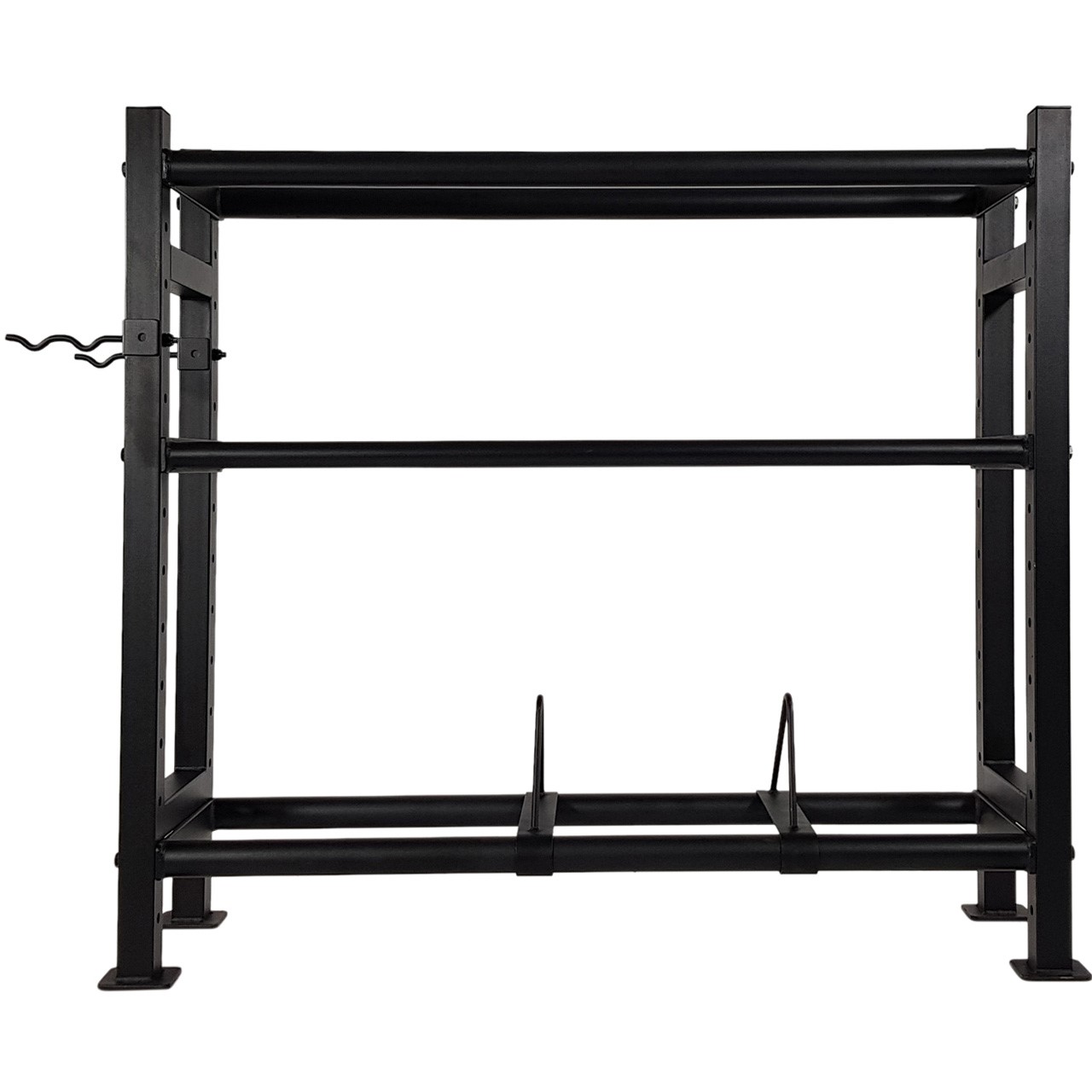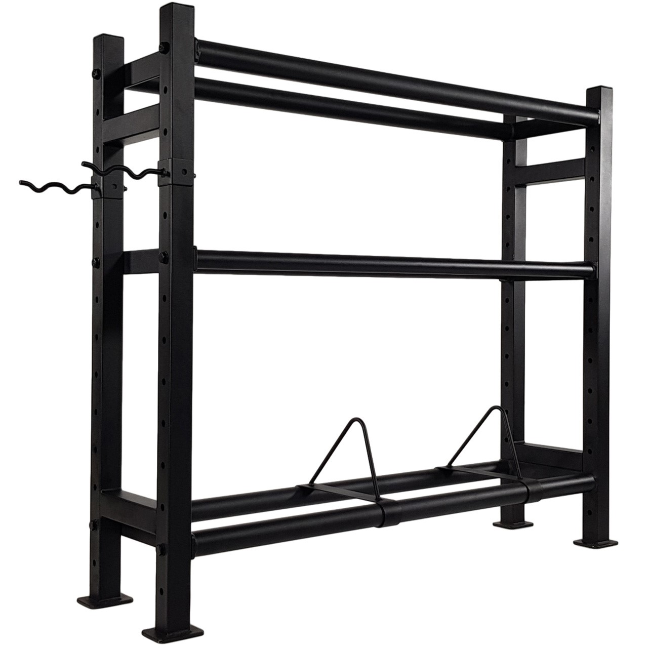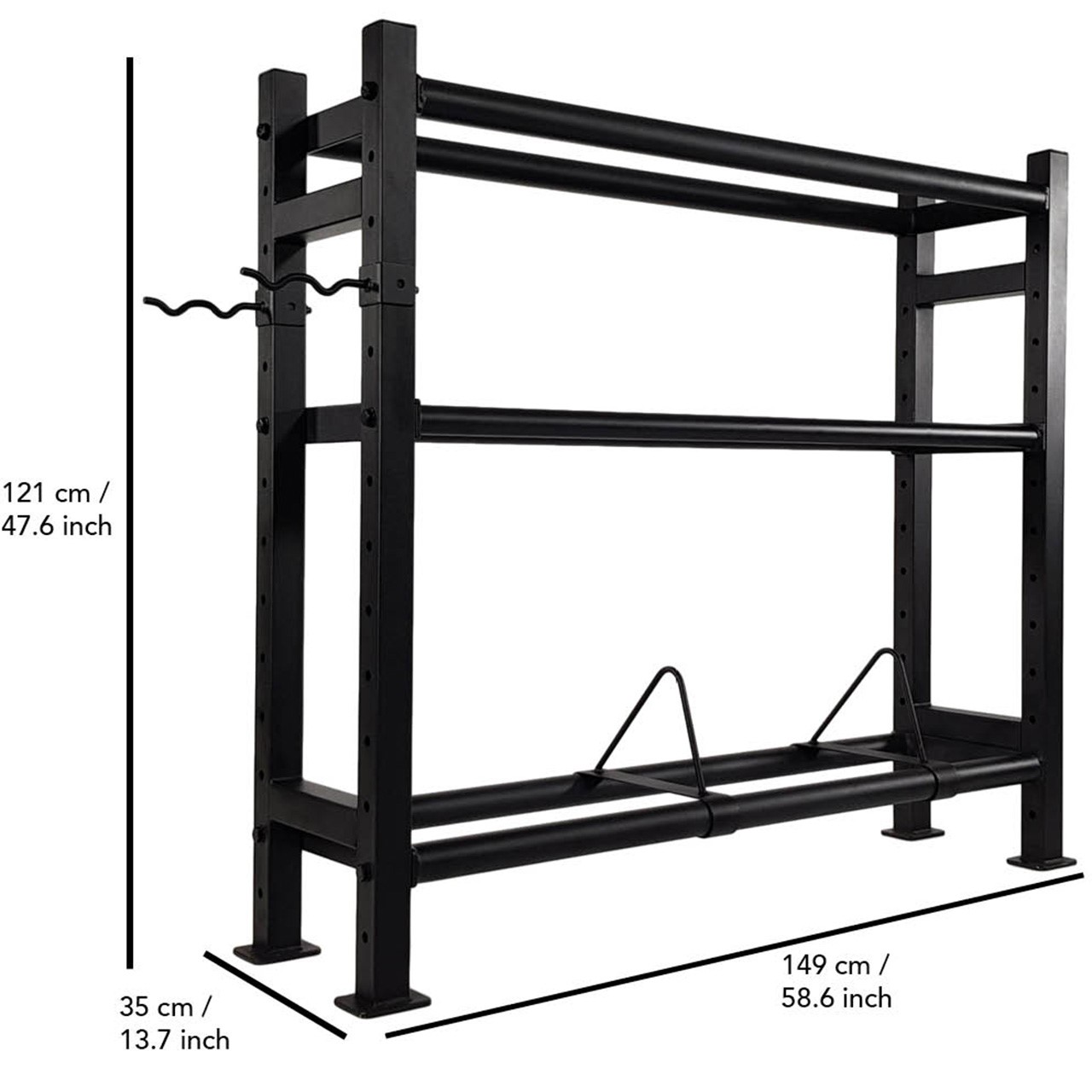 Ce système ingénieux à 3 niveaux offre un espace de rangement optimal pour différents types d’accessoires de fitness : la partie inférieure est parfaite pour les disques de musculation, l’étagère centrale accueille vos kettlebells, tandis que le niveau supérieur est conçu pour les wall balls. Malgré sa construction robuste, ce rack occupe peu de place au sol. Sa structure en métal massif garantit une excellente stabilité, une grande durabilité et une capacité de charge élevée – idéale pour un usage quotidien.