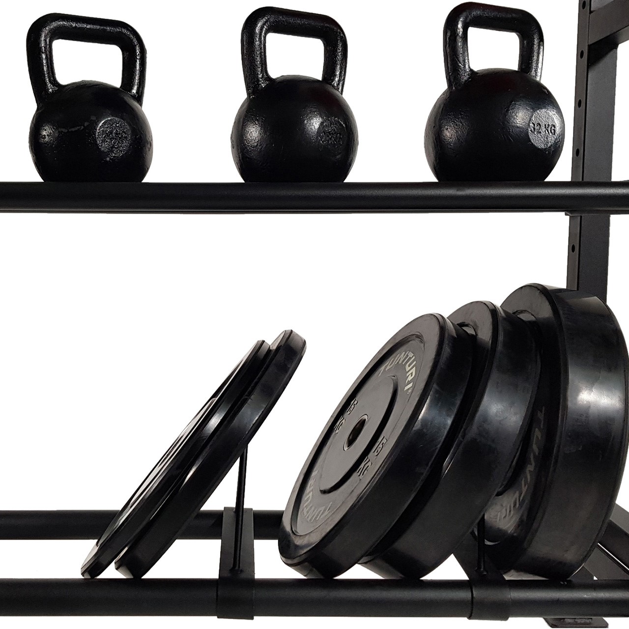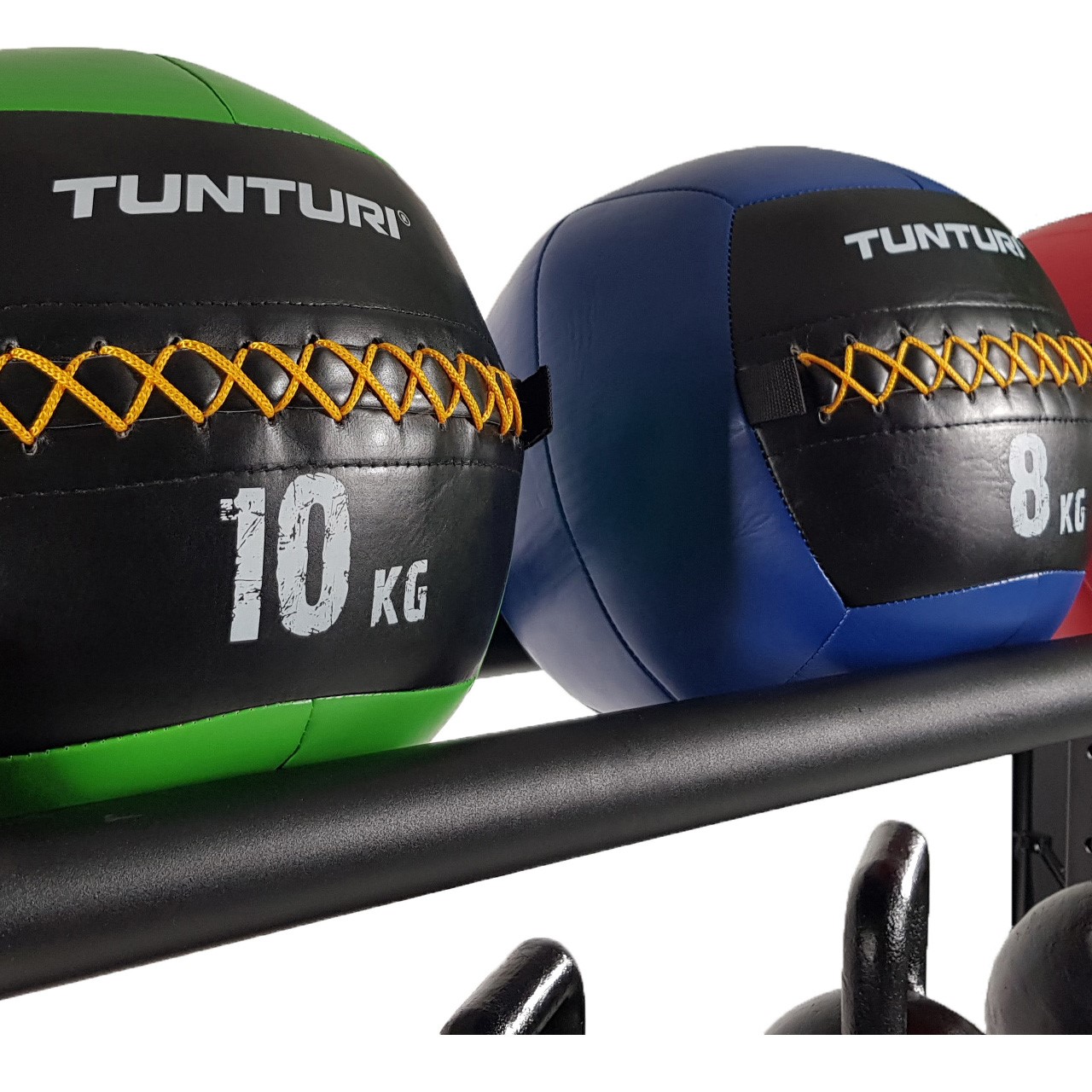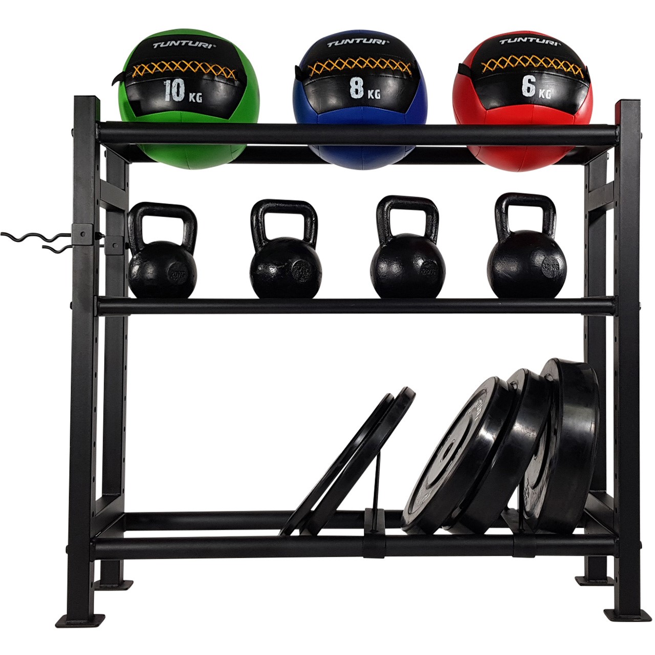 L'entraînement musculaire varié avec des kettlebells, wall balls et disques de musculation nécessite un espace bien organisé. Le rack de rangement multifonction Tunturi (14TUSCF063) est la solution idéale pour stocker votre équipement d'entraînement en toute sécurité, de manière ordonnée et peu encombrante – que ce soit à la maison ou dans une salle de sport professionnelle.