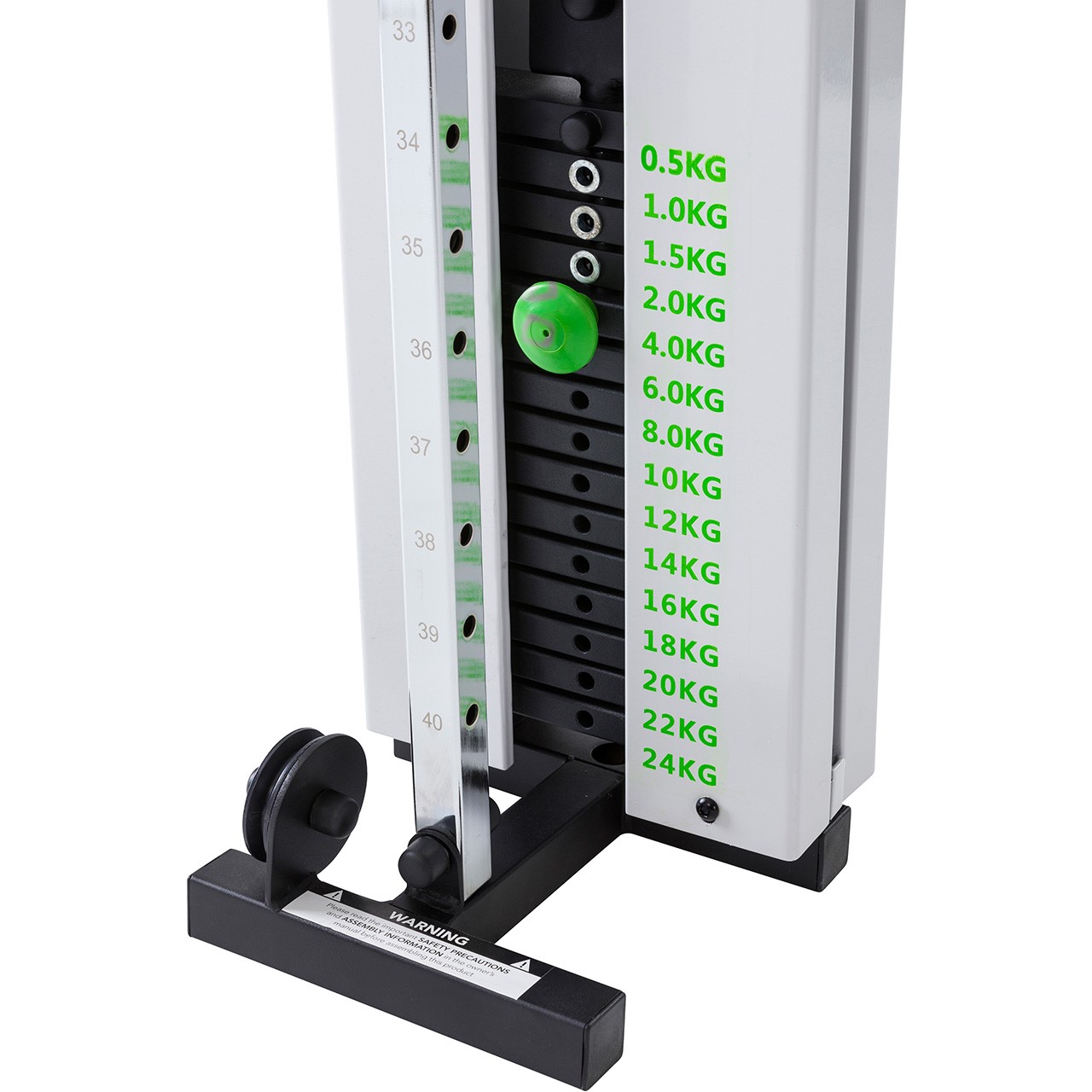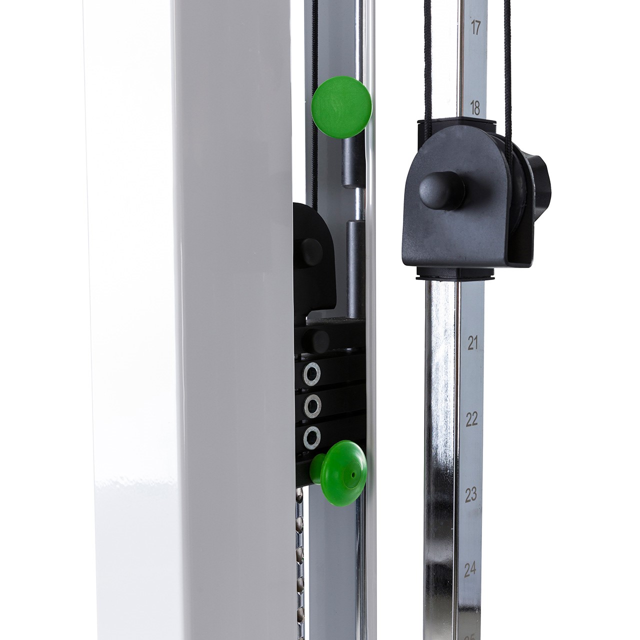 Le réglage en hauteur et la progression des poids peuvent être adaptés à vos besoins. Une barre incluse dans le kit permet également un entraînement ciblé des muscles du grand dorsal ainsi que des autres muscles du dos. Le réglage du poids se fait via un mécanisme de verrouillage en aluminium de haute qualité. La station de tirage est équipée de 4 poids en aluminium de 0,5 kg et de 11 poids de 2 kg, offrant ainsi une charge totale de 24 kg.