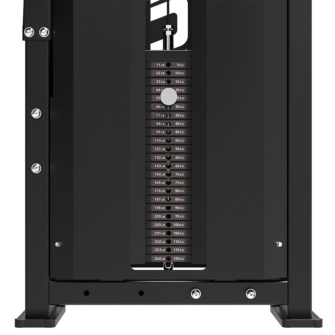 La pile de poids allant jusqu’à 120 kg, avec un poids additionnel de 2,5 kg, permet des réglages précis par incréments de 2,5 ou 5 kg pour un contrôle maximal de l’entraînement.