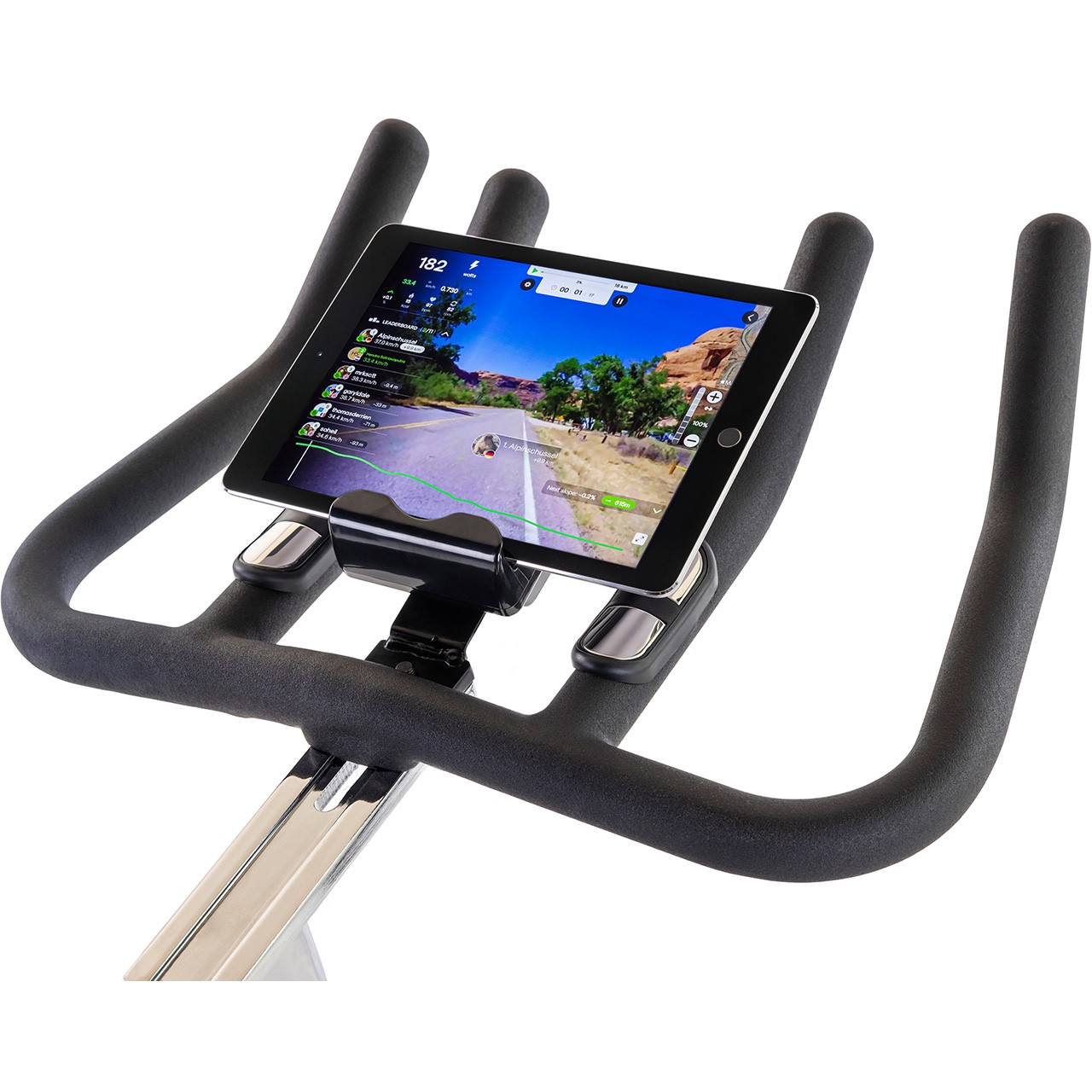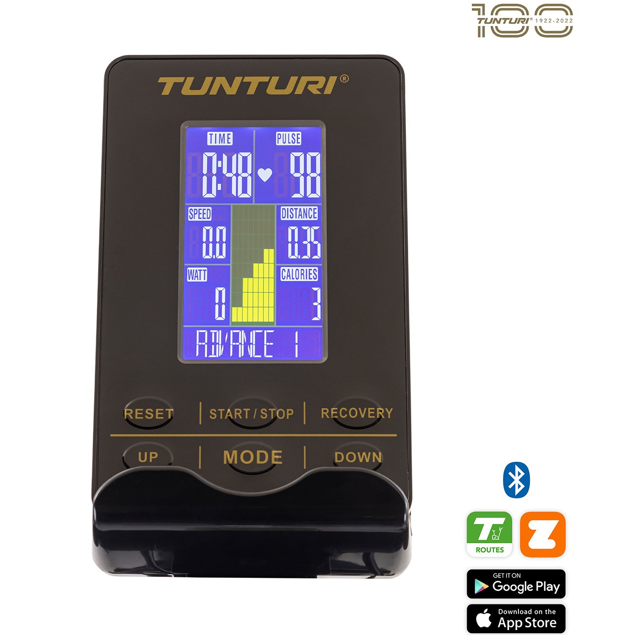 À travers l'écran couleur du S100 Centuri, vous pouvez non seulement surveiller et contrôler tous les paramètres d'entraînement, mais également connecter votre entraînement à des applications telles que Tunturi Routes, i-Console+, Kinomap et Zwift. La connectivité Bluetooth assure une connexion rapide et facile, vous permettant de commencer votre entraînement immédiatement. Placez simplement votre tablette ou smartphone sur le support prévu et profitez d'un entraînement varié et motivant.