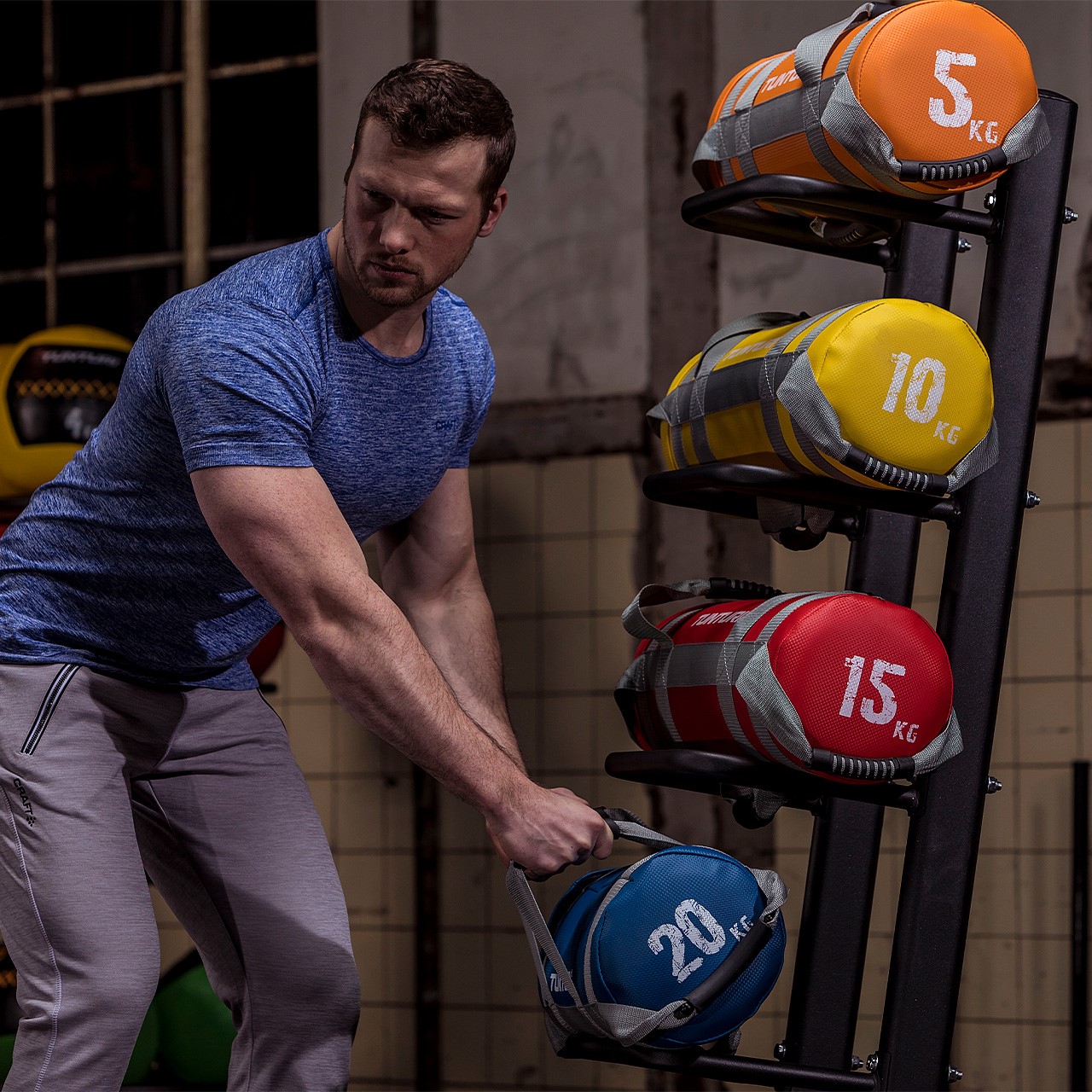 Avec le Tunturi Fitness Strength Bag Rack (14TUSCF091), vous mettez de l’ordre avec style dans votre espace d’entraînement. Ce système de rangement astucieux peut accueillir jusqu’à 5 sacs de sable et séduit par sa construction verticale peu encombrante – idéale pour une salle de sport à domicile ou un centre de fitness professionnel.