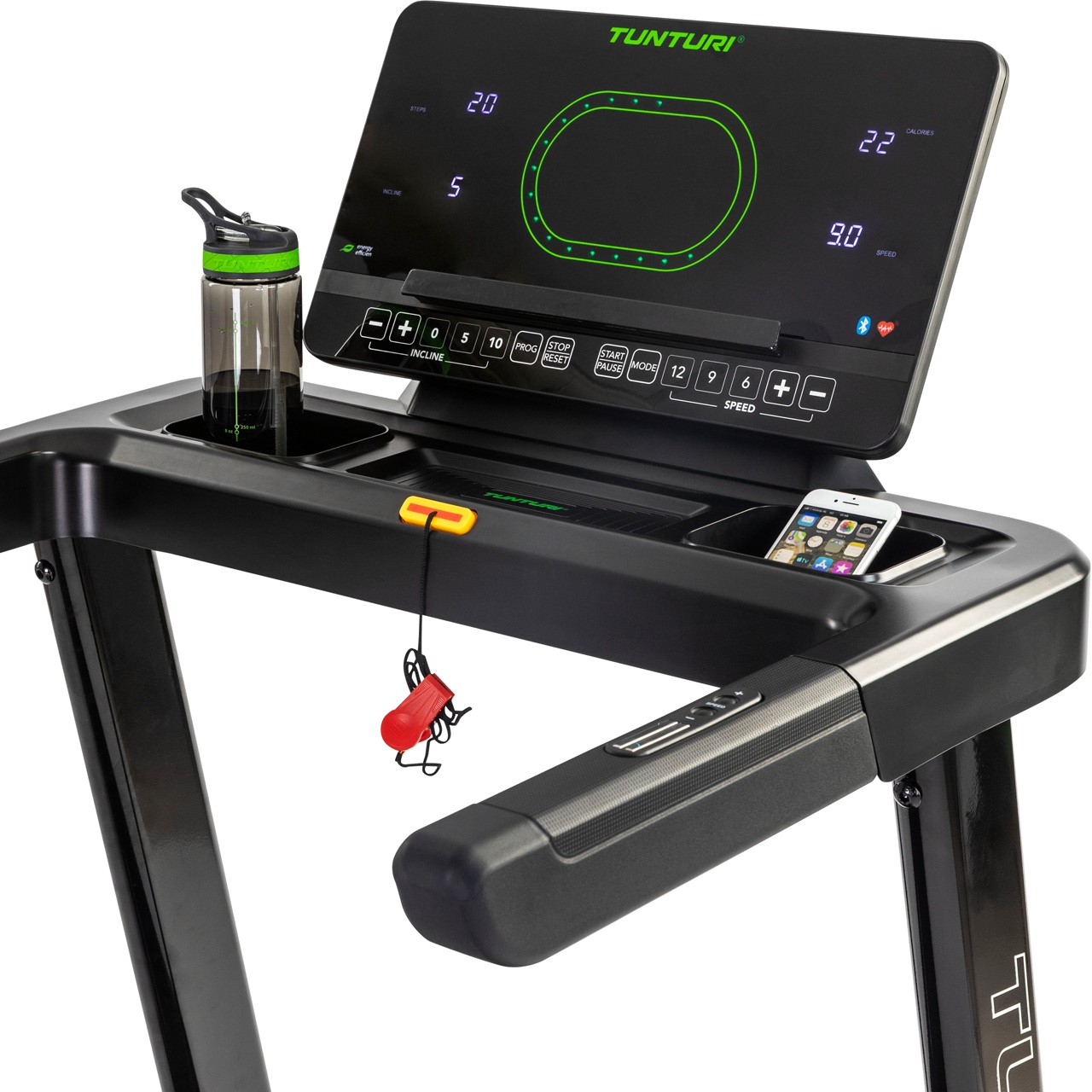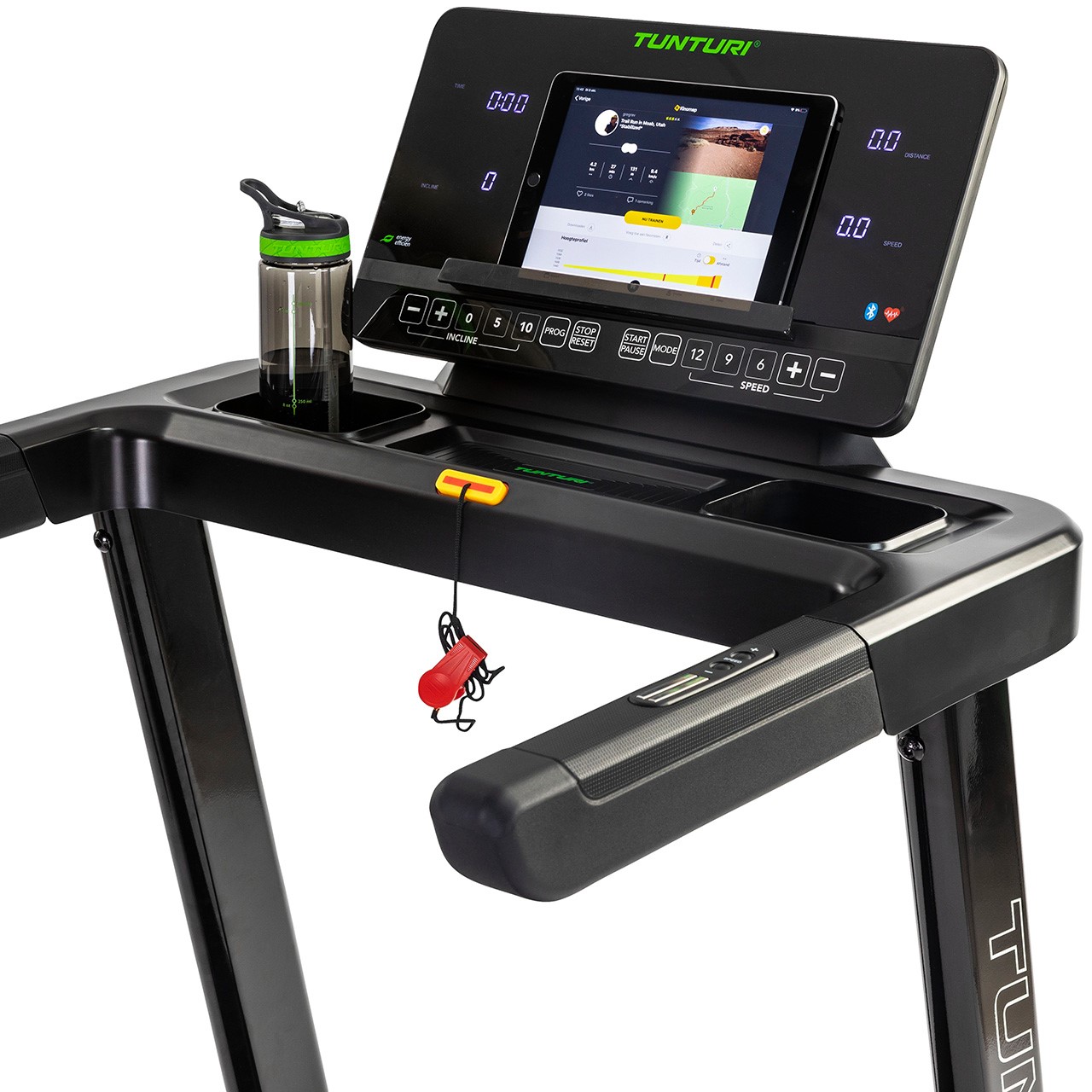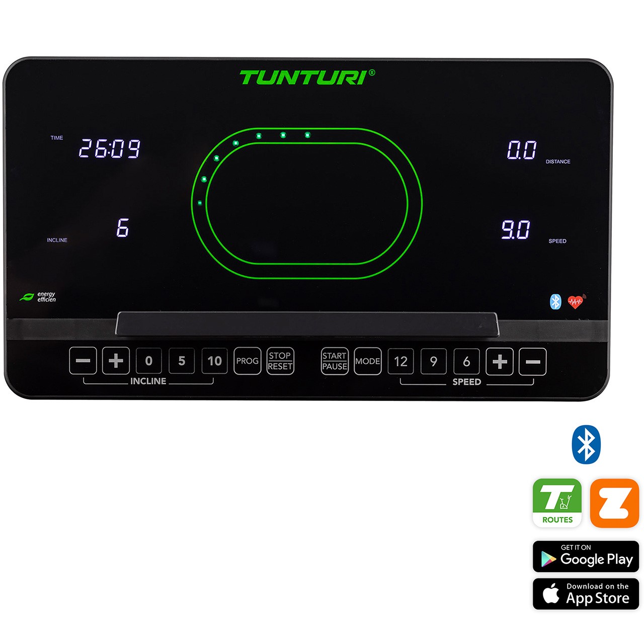 L'écran LED moderne propose 47 programmes d'entraînement et une piste de course de 400 mètres pour rendre vos séances plus variées. Grâce à la connectivité Bluetooth, vous pouvez connecter votre tablette ou smartphone et explorer plus de 50 000 parcours virtuels avec Tunturi Routes, AnyRun ou Kinomap.