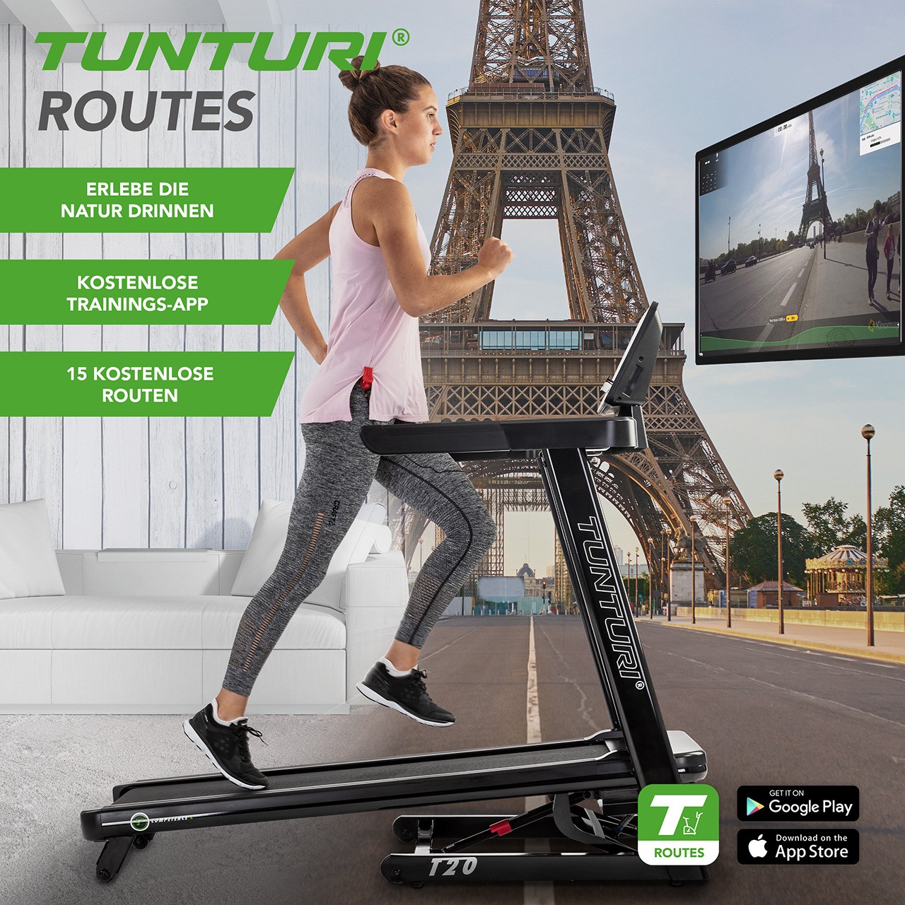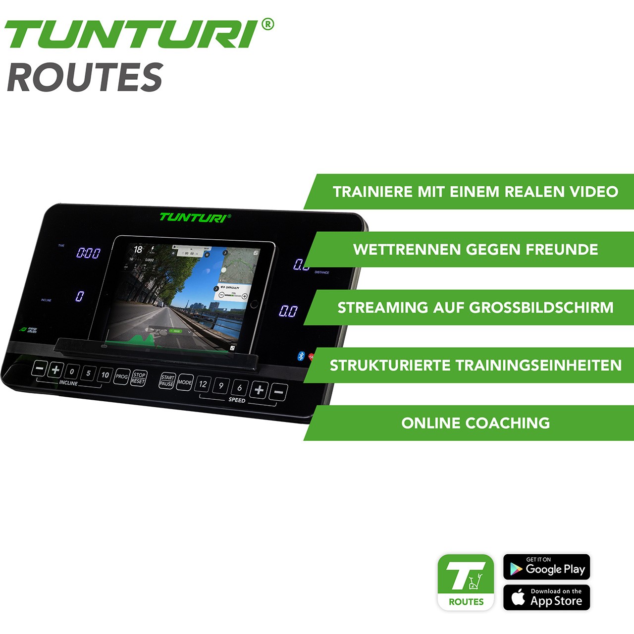 | Apps pour tablettes et smart phones: | Tunturi Routes, Anyrun, Kinomap & Zwift |