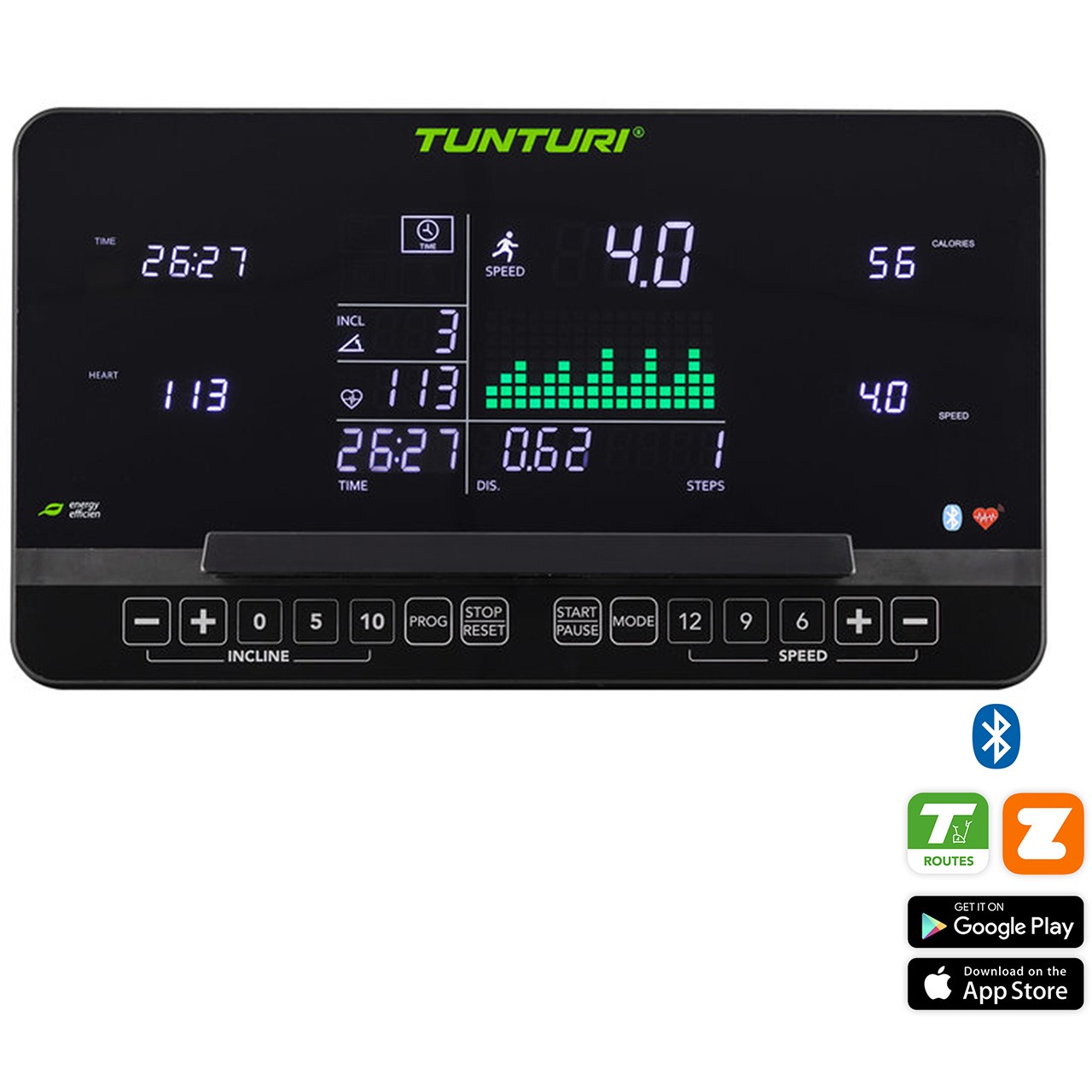 | Apps pour tablettes et smart phones: | Tunturi Routes, Anyrun, Kinomap & Zwift |