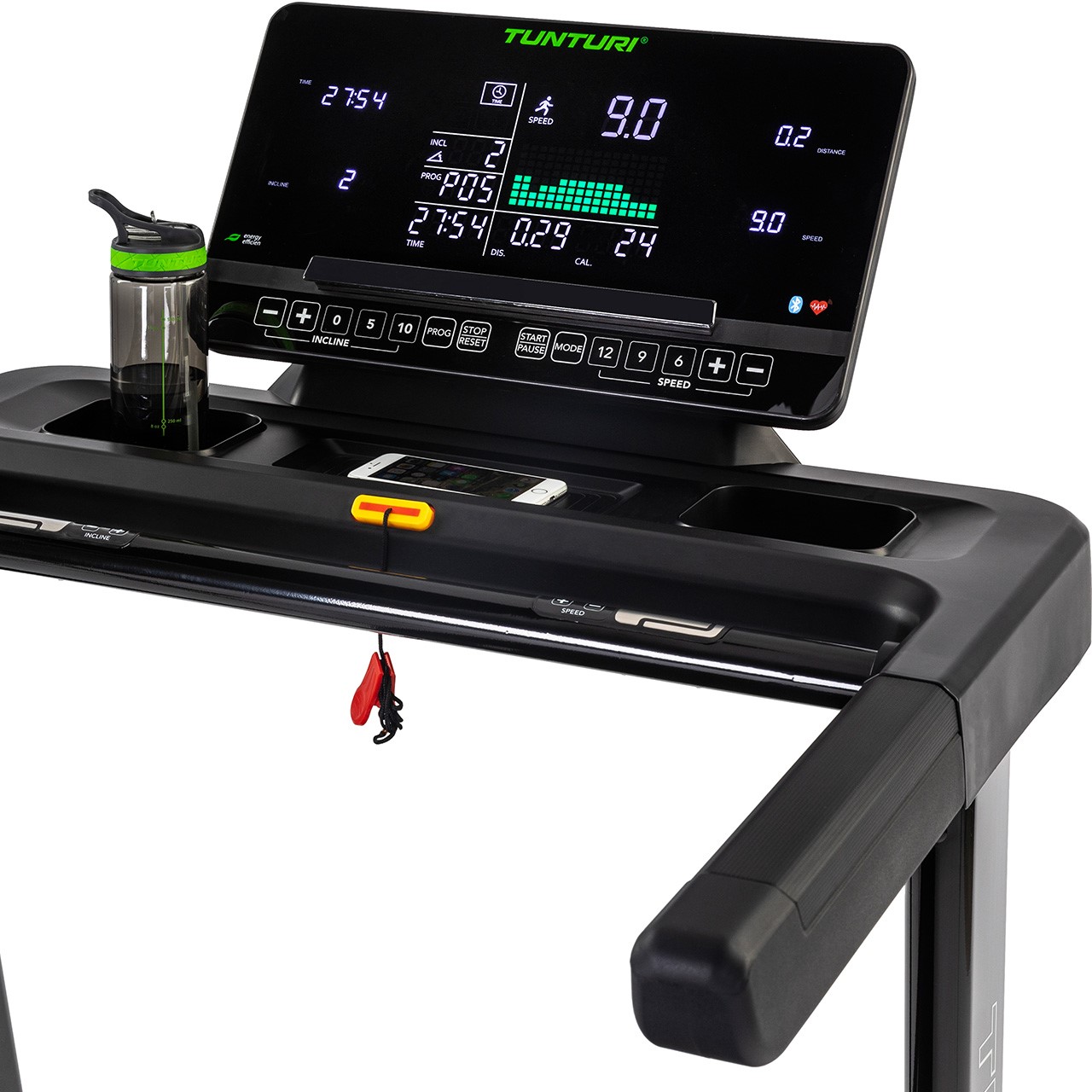Le grand écran LCD du tapis de course Tunturi T60 permet de contrôler 44 programmes différents et affiche graphiquement vos données de performance. Pour encore plus de diversité d'entraînement, vous pouvez connecter votre tablette, smartphone ou téléviseur via Bluetooth et utiliser des applications telles que Tunturi Routes avec plus de 50 000 lieux différents, ainsi que Anyrun, Kinomap ou Zwift.