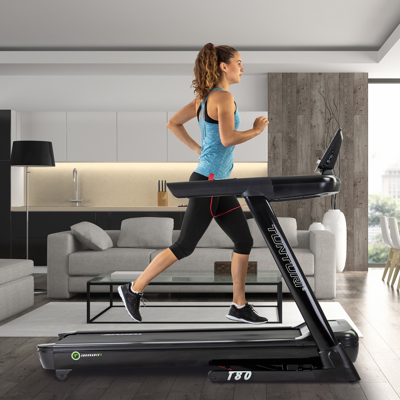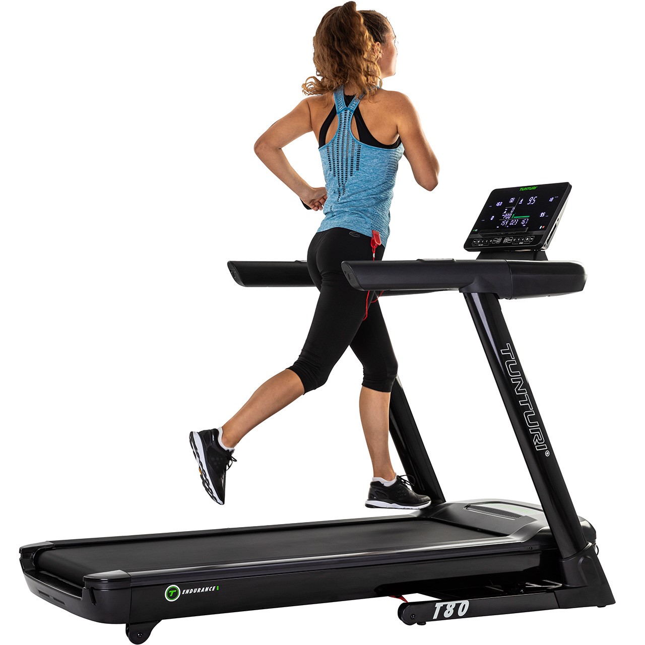 Le tapis de course Tunturi Endurance T80 offre une vitesse maximale de 22,0 km/h et des inclinaisons jusqu'à 15 niveaux. Le moteur silencieux et puissant atteint une puissance de 5,5 CV