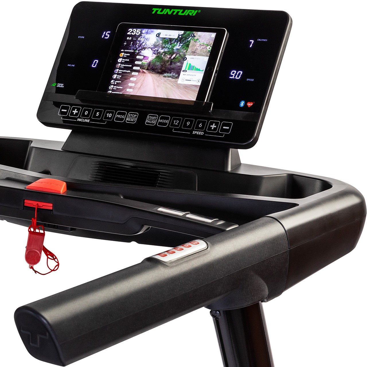 Le grand écran LED de 10 pouces du tapis de course Tunturi T90 Endurance propose 44 programmes différents et affiche graphiquement vos données de performance. Pour encore plus de variété dans vos entraînements, vous pouvez connecter votre tablette, smartphone ou téléviseur via Bluetooth et utiliser des applications telles que Tunturi Routes avec plus de 50 000 emplacements différents, Anyrun, Kinomap et Zwift.